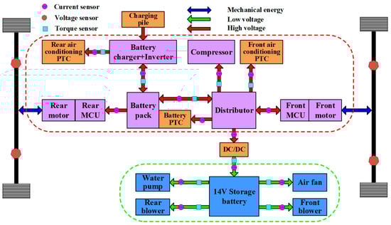 In order to assess the energy distribution and comprehensively monitor the running state of the vehicle during the test process, a variety of sensors were installed on the tested EV. The vehicle status signal was recorded immediately, and the energy flow data were obtained. A variety of pressure, temperature, flow, current, voltage, and torque sensors were installed at key locations in waterways and electric circuits. According to the characteristics of the measured signal, all sensors were carefully chosen and calibrated. In order to precisely monitor the vehicle’s status during testing, some vehicle signals were obtained from the vehicle controller area network (CAN) bus. All the signals and information were integrated into the data acquisition system at the same time. Through the integrated output of multi-source information, the synchronous testing of the mechanical power flow, heat flow, and electric power flow of the vehicle are realized. The schematic of the sensor layout scheme in the tested EV power system and thermal management system used in this experiment are illustrated in Figure 2 and Figure 3, respectively. The measurement devices, sensors, and their properties are listed in Table 2.