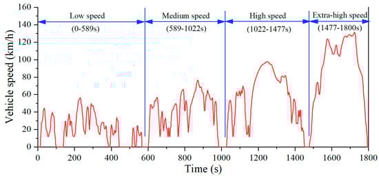 In this paper, the EV was tested under a WLTC according to “measurement methods of fuel consumption for light-duty vehicles (GB/T 19233-2020)” [47] and “Electric vehicles-Energy consumption and range-Test procedures (GB/T 18386-2017)”. The WLTC test conditions include four simulation conditions: low, medium, high, and extra-high speed. Each period of the WLTC is 1800 s, and the test distance is 23.25 km. The maximum and average speeds of the WLTC are 131.3 km/h and 46.51 km/h, respectively. The details of the WLTC are shown in Figure 4. Before the WLTC test, the vehicle coasting test should be conducted to obtain the resistance test on a 0-degree road.