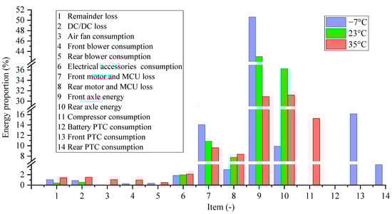 Note that the motor and MCU losses account for a large proportion under all temperatures due to copper loss, iron loss, and heat transfer loss [49,50]. From Figure 5, the heat transfer loss of the front motor and the MCU at −7 °C, 23 °C, and 35 °C is 5.24 kWh, 6.11 kWh, and 5.57 kWh, respectively, while the whole energy loss of the front motor and the MCU at −7 °C, 23 °C, and 35 °C is 10.09 kWh, 10.97 kWh, and 9.08 kWh, respectively. This means that most of the front motor and MCU losses are heat transfer losses at different temperatures, and this is the same for the rear motor and the MCU. In Figure 5, it can also be seen that the power battery pack thermal transfer loss at −7 °C is much higher than that at 23 °C and 35 °C. This is because the battery power characteristics worsen, and the charging and discharging efficiency decreases at low environment temperatures [51]. The thermal management system should improve the power battery pack temperature to ensure the good power characteristics of the battery, leading to high thermal transfer losses. Generally speaking, research on energy regeneration technology is very important. It is an effective way to improve vehicle energy utilization efficiency [52,53]. Although more regeneration energy can be recovered, this can only be achieved during the braking process [54,55]. In Figure 5 and Figure 7, the proportion of battery-recycled energy under braking conditions at 23 °C (75.84%) is much higher than that at −7 °C (53.15%) and 35 °C (62.79%). This is another reason for the higher energy utilization and the longer driving range for testing the EV at 23 °C. It should be pointed out that the compressor energy consumption accounts for a large proportion in both braking and driving conditions at 35 °C, and the proportions are 15.25% and 12.41%, respectively. However, the compressor energy consumption is basically 0 in both braking and driving conditions at −7 °C and 23 °C. That is because the compressor needs to work for a long time to guarantee the normal operation of air conditioning and decrease the temperature in the car under high environmental temperatures [56]. The other losses such as DC/DC losses, air fan consumption, front and rear blower consumption, and electric accessories consumption are very small under all environmental temperatures, and those have little effect on the energy consumption of the whole vehicle.