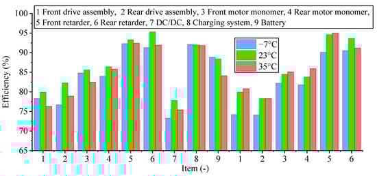 The power system and component working efficiency under different temperatures is shown in Figure 8. It can be seen that most of the power system and component working efficiencies are less than 90%, except for the retarder and charging system under all environmental temperatures. Some measures can be taken to improve the efficiency of the relevant components, especially for the motor drive assembly system, which has high energy consumption (See Figure 6 and Figure 7). On the whole, the power system and component working efficiency at 23 °C is higher than that at −7 °C and 35 °C. To some extent, this also reflects that the electric vehicle has the highest energy efficiency at 23 °C.