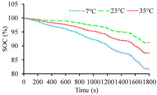 The power battery pack thermal transfer loss at −7 °C is much higher than that at 23 °C and 35 °C due to the low charging and discharging efficiency and the high energy consumption required to warm up the battery at low environmental temperatures. Therefore, the SOC of the battery drops the fastest at −7 °C, followed by 35 °C, due to differences in the power demands of the air conditioning, the warm air PTC, and the battery PTC under high and low environmental temperatures. The working condition of the front motor under driving conditions at 35 °C is the most severe and leads to the lowest working efficiency. On the whole, the efficiency of the power system and the components working at 23 °C is higher than that at −7 °C and 35 °C.