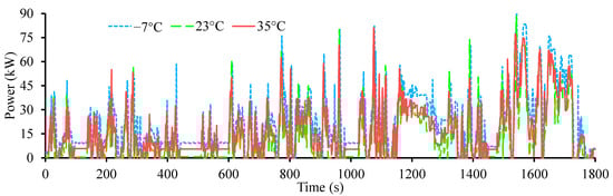 In order to determine how the environmental temperature influences the energy flow characteristics of the tested EV, the energy flow experiment was carried out under the environmental temperatures of −7 °C, 23 °C, and 35 °C to ensure that the climate chamber is performing in accordance with a realistic environment.