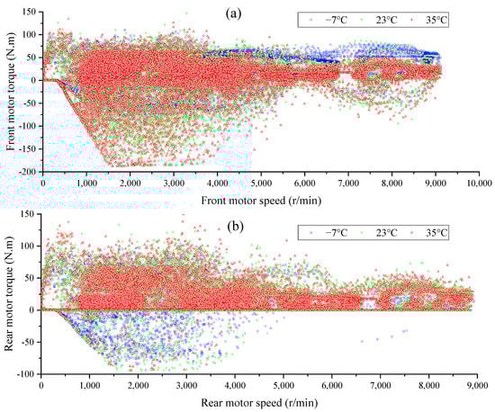 The motor working points distributions are very important to vehicle drive and energy recovery. This will have a big impact on the efficiency of battery output power and energy recovery [61]. The front and rear motor operation point distributions at different temperatures are shown in Figure 11. It is possible to see that the front motor working points under driving conditions are most widely distributed at 35 °C followed by −7 °C (Figure 11a). This indicates that the working condition at 35 °C is the most severe and leads to the lowest working efficiency (see Figure 8), while for the front motor working points under braking conditions, the motor working points at 23 °C and 35 °C are mainly in the relatively high efficiency areas, leading to higher working efficiency than that at −7 °C. The front motor working efficiency under driving conditions at −7 °C, 23 °C, and 35 °C is 84.8%, 82.5%, and 85.6%, respectively, while that under braking conditions is 82.2%, 84.5%, and 85.1%, respectively (see Figure 8). For the rear motor, the working points under driving conditions are most widely distributed at −7 °C, followed by 35 °C. In addition, the working point characteristics of the rear motor under braking conditions are similar to the front motor (see Figure 11b). The rear motor working efficiency under driving conditions at −7 °C, 23 °C, and 35 °C is 84%, 86.4%, and 85.8%, respectively, while that under braking conditions is 81.8%, 83.8%, and 85.9%, respectively (see Figure 8). Note that it can be seen that the negative torque of the front motor has a wider distribution range than that of the rear motor and the absolute value is larger, indicating that the front motor undertakes more energy recovery work (see Figure 5).