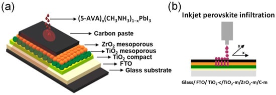 The perovskite precursor solution (5-AVA)xMA1−xPbI3 (reference 76802, Solaronix) in gamma-butyrolactone (GBL) solvent containing lead iodide (PbI2) and methylammonium iodide (MAI) in equimolar concentration (1.2 mol/mL) with 5 mol% of 5-ammoniumvaleric acid iodide (5-AVAI) was transferred to an inkjet printer cartridge. Then, a total quantity of 3.85 µL was infiltrated all over the TiO2/ZrO2/Carbon filled area with a drop-on-demand inkjet printer (PixDro LP50, 512 nozzle printhead) at a resolution of 1200 × 1200 dpi. The samples were annealed for 10 min on a hot plate set to 50°C to form the desired perovskite crystal structure.