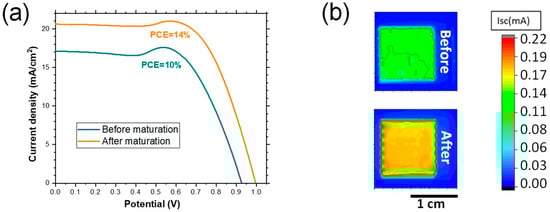 Figure 2a presents the typical J-V curves obtained for both freshly processed solar cells (green) and the same devices exposed to the additional post-treatment (orange). It illustrates the maturation phenomenon observed through an improvement of the J-V curve affording higher PCE, which is related to both higher Jsc and Voc. It could be noticed that both J-V curves present an unusual “hump” pattern. As previously reported in the literature [