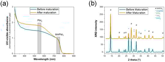Figure 3a,b, respectively. For these two analyses, the carbon paste layer was peeled off just before the analyses in order to better reveal the sole perovskite. If the perovskite band gap (1.59 eV) and the crystalline phases were strictly equal, some changes occurred within the perovskite material. After maturation, an increase in the PbI