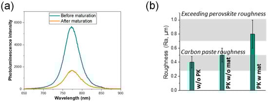 Figure 4b presents roughness measurements realized on the top carbon electrode before and after maturation. It can be observed that before maturation the roughness is close to virgin carbon paste (i.e., 0.5 ± 0.1 μm vs. 0.4 ± 0.08 μm, which is quite equivalent), and then the value increases after maturation (0.8 ± 0.2 μm). As the perovskite precursor solution is infiltrated through the mesoporous layer, some perovskite could remain within carbon and the increase in roughness can be considered as evidence of either a small perovskite reorganization or a small perovskite passivation in PbI