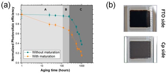Figure S2 in Supplementary Materials. After this, a continuous decrease in performance can be observed whatever the initial treatment. It is the Phase named “C”. After 1000 h of aging, all cells show performances too low to be qualified as functional. However, we can note a more important degradation of the performances for the matured cells than the non-matured ones (for both normalized or non-normalized representations of PCE evolution). This decrease in performance is partly explained by the decrease in J