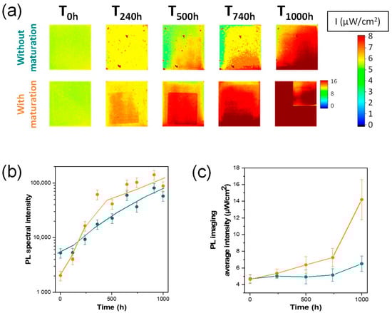 Figure 6b,c, we can observe that PL imaging data are in line with PL spectral data. Both follow an inverse trend than the PCE variation, i.e., the more the PL increase, the more the PCE decrease.