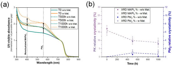2 amount during the aging. Then, between 500 and 1000 h, XRD diffractograms do not vary considerably, but a second transition emerges on UV–visible spectra at 400 nm for both types of cells. The latter is attributed to the formation of monohydrated perovskite [