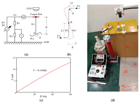 Experimental setup for testing corona thrust from a pair of needle electrodes: (a) Schematic diagram of the total experimental setup; (b) Schematic definition of the deflection angle β of the “Z” shaped needle electrode W2; (c) Relationship between thrust F from the tips’ corona discharge of electrode W2 and deflection angle β of electrode W1; (d) Photos of the test site, 1—high voltage transformer, 2—current resister, 3—rectifier diode, 4—filtering capacitor, 5—micro-ampere meter, 6—voltage divider, 7—voltage digital displayer, 8—autotransformer, 9—digital camera, 10—corona-free copper rod, 11—electrode W2 (marked with a red circle), 12—stainless steel wire W1, 13—ground.