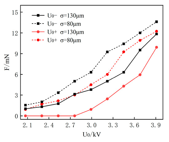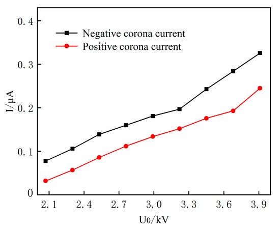 The corona currents for both positive and negative electrodes at different voltages were measured with an ampere (μA) when the curvature diameter of W2 was 130 μm, as shown in Figure 3. It can be seen that the corona current increases with the increase of applied voltage U0, regardless of the voltage’s polarity. Another obvious trend can be found, which is that a negative needle electrode has a stronger corona current than a positive one at the same voltage.