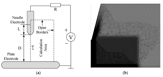 (a) Needle-plate corona discharge simulation model; (b) Mesh grids dissection in the calculational area.