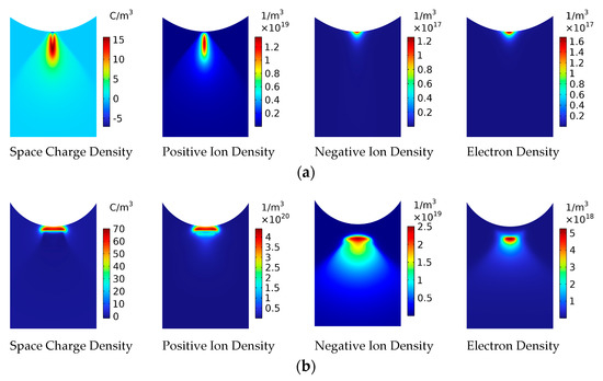 The simulation result shows that the ion density at the tip of needle electrode reaches the maximum value at the pulse peak time [19]. Figure 6 shows the ion distributions at a certain pulse peak time for both positive and negative polarity. It can be clearly seen that the density of each ion in the gap is larger during negative corona discharge. In addition, the density of positive ions is higher than that of the negative by one to two orders of magnitude, which indicates that there are more net positive ions for both positive and negative polarities. From the space charge density distribution map, it can be known that the negative electrode tip has more net positive ions than the positive electrode tip.