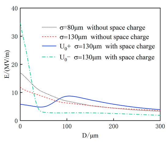 Figure 7 shows the partial electric field along the axis of the needle electrode. It can be seen from this figure that the extra electric field formed by the positive ions in front of the needle electrode strongly distorted the original electric field. Two obvious trends are: (1) A smaller diameter of curvature leads to a stronger electric field at the tip of the needle and then produces an intense corona discharge if the applied voltage is the same. (2) The local electric field strength in front of the negative needle electrode is higher than that of the positive if the diameter of needle electrodes is the same, which generates stronger corona and thrust.