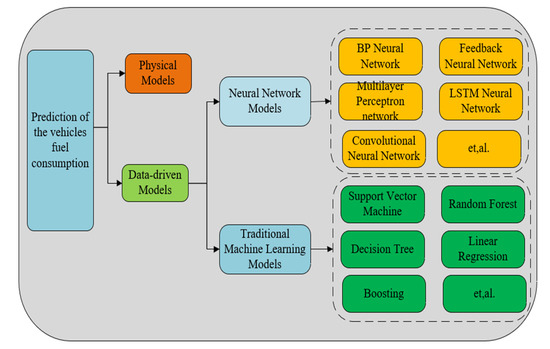 At present, the prediction methods for vehicle fuel consumption can be roughly classified into two categories (as shown in Figure 1): (1) a physical fuel consumption prediction model constructed based on the principle of vehicle dynamics; (2) a data-driven fuel consumption prediction model.