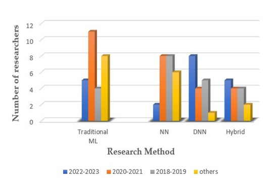 When using physical models to predict fuel consumption, researchers are required to possess strong domain knowledge, and the application scope is limited, making it challenging to widely apply them to vehicles with different characteristics. The introduction of data-driven methods effectively addresses the limitations of physical models. Well-trained models in data-driven approaches can consider data from different factors as inputs, and their application extends to a wider range of vehicle types. This paper discusses the applications of traditional machine learning (Traditional ML) and the neural network method in the prediction models of fuel consumption based on data-driven models (the process of realizing a fuel consumption prediction by the model is shown in Figure 2). Therefore, based on the existing studies listed in this paper, the above two commonly used data-driven methods are summarized from the two aspects of research years and the number of researchers (as shown in Figure 3).