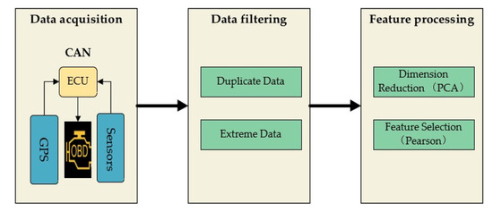 Due to the possibility of errors or communication failures during the data collection process, it is necessary to filter the original data to eliminate invalid and redundant data, including duplicate data, extreme data, and not-running vehicle data (such as data with a speed of 0 or GPS information not updated for a long time). For the filtered effective data, depending on feature engineering, is necessary to establish a dataset with a high correlation to fuel consumption, aiming to improve the robustness and convergence speed of the prediction model (as shown in Figure 4). This process mainly involves two stages: feature dimensionality reduction and feature selection. Principal component analysis (PCA) and Pearson correlation coefficient (PCC) are the most commonly used techniques. PCA is commonly used for unsupervised dimensionality reduction tasks. It employs linear transformations to map the original features to a new low-dimensional space. By maximizing the variance, PCA enhances the separability between samples, thereby preserving as much original data information related to fuel consumption as possible. The PCC method is used to measure the strength of the linear relationship between two variables, and a correlation coefficient between −1 and 1 is obtained by calculating the variance between variables to achieve the best variable screening. In addition, sensitivity analysis is also used to determine the influence of an input variable on an output variable. The higher the sensitivity coefficient, the stronger the correlation between the variables (see Equation (8)):