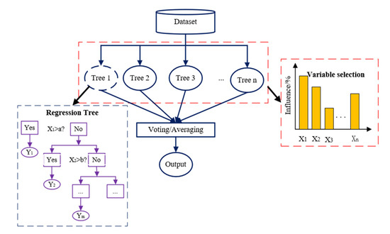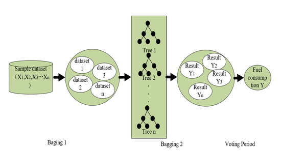The RF model is a supervised learning algorithm that uses an optimal decision tree to learn rules from a given sample. The importance of each data can be estimated during the execution of the algorithm, and missing values can be automatically processed. The working principle is shown in Figure 7. In Figure 8, bagging stage 1 performs random sampling with dropout to achieve the reorganization of the new dataset; in bagging stage 2, the decision tree optimizes the relevant data and extracts features; the voting period is responsible for voting on the results generated by each decision tree to determine the optimal fuel consumption output.