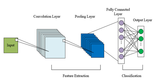 CNN uses convolution operation to extract features from input data, which has a local connection and power-sharing characteristics. Compared to RNN, CNN is suitable for processing data with spatial structures. CNN is composed of a convolutional layer, a pooling layer, and a fully connected layer, as shown in Figure 11. The convolution layer performs convolution calculations for input and extracts features; the pooling layer reduces the computation by reducing the dimension of data; and the full-connection layer is responsible for the output of results.