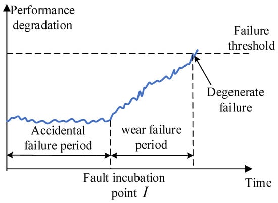 (1) As shown in Figure 3, the performance degradation of gearbox bearings of wind turbines consists of two stages. The first stage is the accidental failure period, during which it is difficult to intuitively find the abnormal phenomenon of bearings from the monitoring data. However, once the equipment starts to run, the fault has already begun to hatch. The second stage is the wear-and-tear failure period. During this process, the degradation trend of gearbox performance due to the long-term operation of the wind turbine becomes more apparent. The fault incubation point is the dividing point between the accidental and wear failure periods.