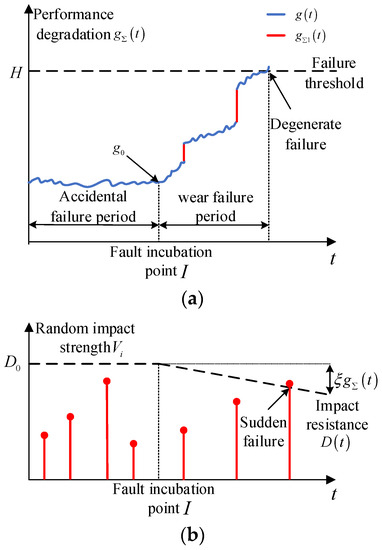 Competitive failure model of gearbox bearing considering fault incubation point: (a) degradation process of bearing under random impact, (b) sudden failure process of bearing under impact load.