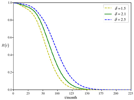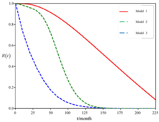 According to the parameters in Table 2, the reliability curves of the three models are calculated and are shown in Figure 5.