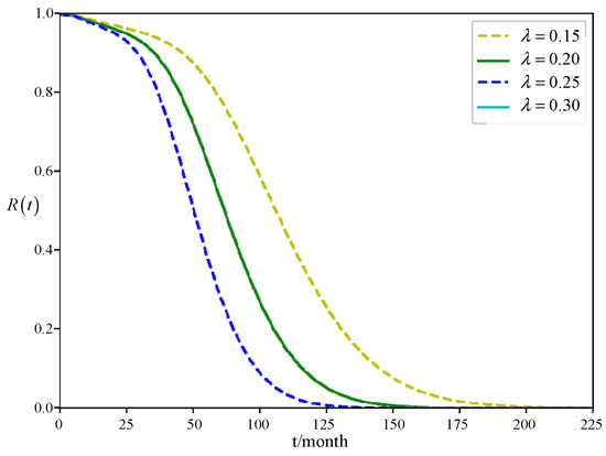 As shown in Figure 6, Figure 7, Figure 8 and Figure 9, when the value of the model increases or the value decreases, the decline speed of the reliability of the gearbox bearing of the wind turbines is accelerated. When the value of increases, the natural degradation speed of the bearings accelerates; when the value of increases, the frequency of random impacts on the bearings increases; when the value of increases, the impact resistance of the bearing decreases faster; when the value of decreases, the fault incubation point of the bearing is advanced, so the reliability of the bearing decreases even more. In addition, by observing Figure 7, it can be seen that the change in value has an obvious influence on the reliability of gearbox bearings, so it can be inferred that the frequency of random impact is the main factor affecting the reliability of bearings, so if you want to prolong the service life of gearbox bearings, you should try to reduce the impact frequency .