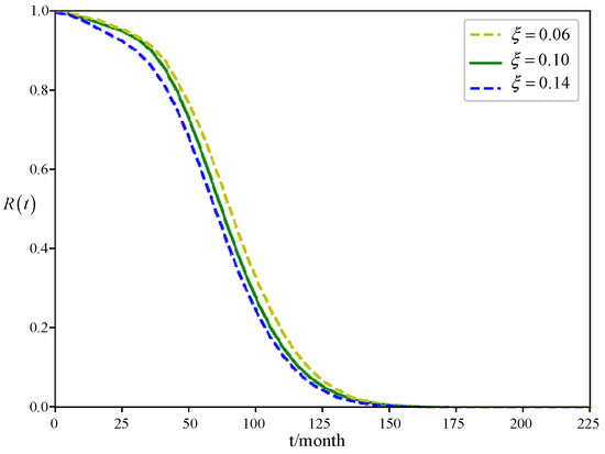 The reliability evaluation method proposed in this paper considers the fault incubation point of the gearbox bearing of wind turbines. Additionally, it considers the natural degradation of the bearing, the acceleration of random impact on the degradation process, and the influence of the degradation process on the impact resistance of the bearing. To verify the reliability evaluation method’s sensitivity, we adjust the analysis model’s key parameters, and the results are shown in Figure 6, Figure 7, Figure 8 and Figure 9.