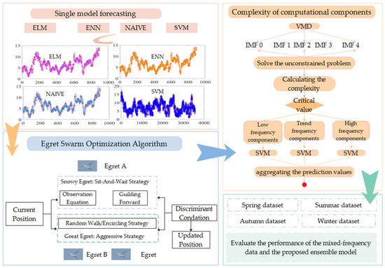 Based on the above analysis, a new ensemble forecast model is developed in this paper in order to achieve higher forecast accuracy. Firstly, the best model is determined by the comparison of single models. Secondly, the original wind speed series are decomposed and reconstructed by using data preprocessing techniques, and the single model is optimized by using the egret population optimization algorithm to set the parameters in the appropriate threshold range and continuously update and iterate to achieve a more accurate optimization effect and then make wind speed forecasts.