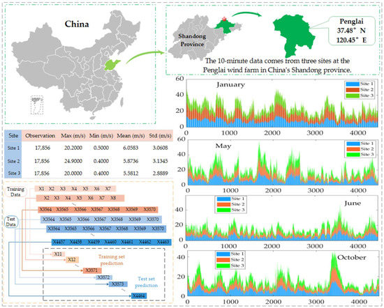 The data used in this study were obtained from the power sector of Shandong Province, China. Penglai City, Shandong Province, located on the Shandong Peninsula, has good geological conditions and available offshore wind resources with obvious geographical advantages. Wind energy resources have a promising development prospect; therefore, accurate prediction of wind speed in the region is important to improve the power supply structure of the power grid and promote the development of the new energy industry. Wind speed is strongly influenced by seasonality. Therefore, this dataset is taken from the time series of wind speed for a representative month in each season. Figure 2 shows the geographical location of Penglai, as well as the summary of information data and wind speed characteristics for spring (1 May to 31 May), summer (1 July to 31 July), autumn (1 October to 31 October), and winter (1 January to 31 January), with less fluctuation in July and more fluctuation in October. By interpolating the anomalous and missing data, 10-min data from three observation sites in the region were used as sample data, and the total number of data points simulated for each month was 4464 figures, including 3570 training data points and 894 test point data.