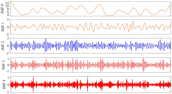 To measure the complexity of Lempel–Ziv, it is necessary to convert the data series into a symbol sequence by comparing the data with a threshold, replacing a specific piece of data with 0 if the sequence is less than the threshold, otherwise replacing it with 1, and then analyzing the symbol sequence by identifying different quantities. When using the VMD method, applying the Lempel–Ziv method to identify the components, it is possible to select the optimal model for each component.
