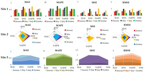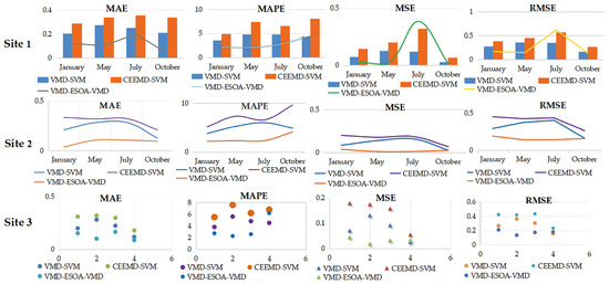 In Figure 4, it can be visually observed that in the histogram presented at Site 1, the height of the SVM is lower than the other models, indicating that the values of MAE, MAP E, MSE, and RMSE are low and thus the performance of its model is better, and the radar plot at Site 2 can directly show the relative advantages and disadvantages of different models, and the closer to the center of the radar plot, the better the performance of the model is, and at Site 3, the smaller the area occupied in the area plot indicates the better performance of the model, so the performance of the SVM in the single model comparison is the best. At the same time, we can also observe in that the values of MAE, MAPE, MSE, and RMSE in January and October are smaller than the values of the other two months, indicating that wind energy resources are abundant in January and October.