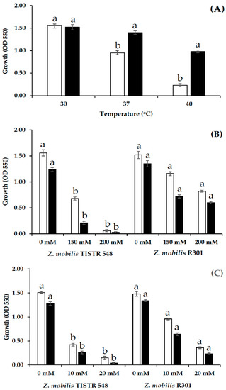 Z. mobilis, specifically wild type, was more pronounced under a high-temperature condition than under a normal growth temperature, which was in line with that reported in