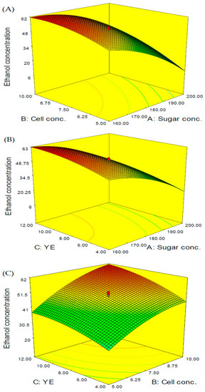 41]. In contrast, the ethanol concentration was increased if the concentrations of bacterial cells and yeast extract increased and the sugar concentration was set at the appropriate level (