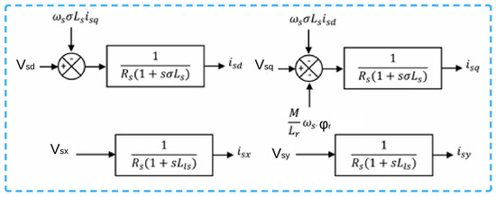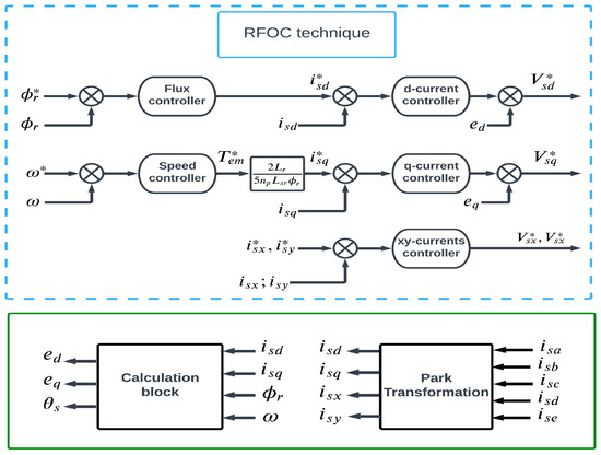 The goal of the RFOC method is to achieve the control of the 5PIM similar to the DC machine [5,9,16], where the d-q stator currents may be adjusted to provide a decoupling between the motor torque and the rotor flux. Laplace transformation is used to impose the machine’s equation in relation to the d-q-x-y frames, yielding [9]: