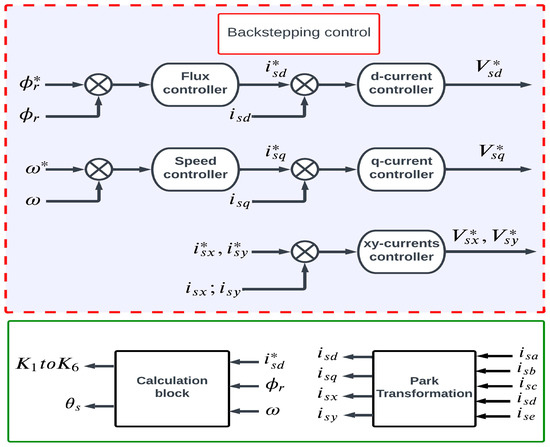 where, the positive values , , , and are chosen to provide a quicker dynamic of motor speed, rotor flux, as well as stator currents. The block diagram of the proposed BSC for the OeW-5PIM topology is shown in Figure 6.