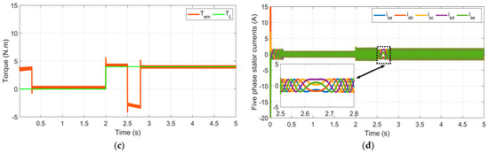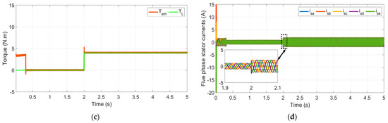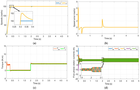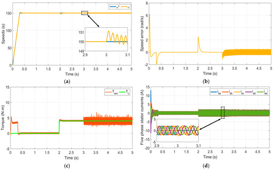 To show the feasibility of the proposed control algorithms, the first conducted test was carried out under load torque variation. The reference speed was set to 157 rad/s. Figure 8 and Figure 9 display the numerous simulation results of the control algorithms for BSC and RFOC beside each other. Figure 8 presents the OeW-5PIM performance of the RFOC strategy with the load torque application at t = 2 s: (a) speed responses; (b) speed error; (c) developed torque; and (d) stator currents, while Figure 9 shows the OeW-5PIM performance of the BSC strategy under the same conditions (a) speed responses; (b) speed error; (c) developed torque; and (d) stator currents.