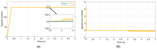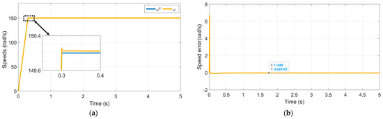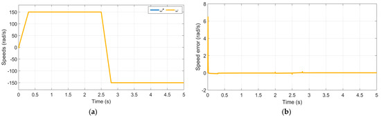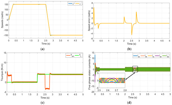 We sought to evaluate the effectiveness of the suggested control strategies under different speed values. Here, there are three steps for the reference speed change, from 0 to 150 rad/s and 150 rad/s to −150 rad/s. Figure 16 and Figure 17 show the simulation results of the OeW-5PIM’s performance for BSC and RFOC during reversal speed. The results present the responses of (a) the speed responses; (b) the speed error; (c) the developed torque; and (d) the stator currents.