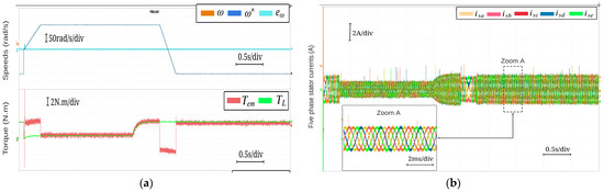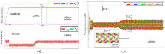 The obtained experimental results of the OeW-5PIM’s performance under an open-phase fault are shown in Figure 14 and Figure 15: (a) speed response and the developed torque response; and (b) is the five phase stator currents. These results demonstrate the reliability of the simulation results for the developed control algorithms when there is an open-phase fault.