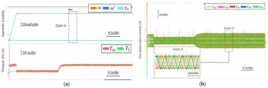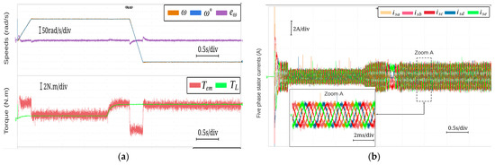 The experimental results of the OeW-5PIM’s performance during reversal speed are presented in Figure 18 and Figure 19: (a) speed response and the developed torque response; and (b) is the five phase stator currents. These results present the validity of the simulation results for the developed control algorithms even under rotor speed variation.