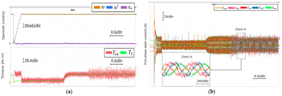 The obtained experimental results are exhibited in Figure 10 and Figure 11,where Figure 10 represents the OeW-5PIM performance of the RFOC strategy: (a) speed responses, speed error, and developed torque and (b) stator currents, while Figure 11 shows the OeW-5PIM performance of the BSC strategy: (a) speed responses, speed error, and developed torque and (b) stator currents. These results show the validation of the effectiveness of the obtained simulation results for the designed control algorithms under load torque variation.