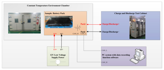 Figure 2. The test equipment consisted of a collection of charge and discharge cabinets (as shown in the attached photo), constant temperature equipment (also shown in the attached photo), a personal computer (PC), and a Controller Area Network (CAN) bus tool. The battery pack under test was composed of LiFePO