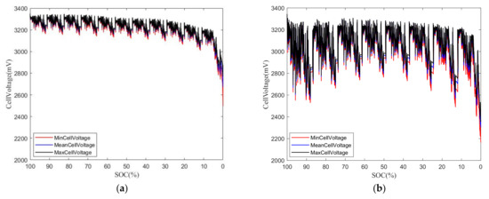 Section 3.1) of the CLTC for the battery pack sample. The curves labelled ‘MinCellVoltage’ and ‘MaxCellVoltage’ represent the minimum and maximum voltage values, respectively, as the SOC changes, across all the battery cells at each temperature. On the other hand, the curves labelled ‘MeanCellVoltage’ represent the average voltage value across all battery cells at each temperature. Existing literature, such as references [