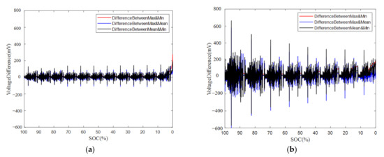 Section 3.1) for the battery pack sample. The voltage differences between cells are important parameters for estimating the SOC and SOH of battery packs. From the curves of voltage differences, the maximum voltage differences reach close to 300 mV and 700 mV at 40 °C and −10 °C, respectively. As we discussed in