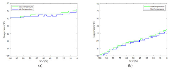 Figure 6 depicts the relationship between temperature and state of charge (SOC) of the battery pack sample at temperatures of 40 °C and −10 °C, respectively. These curves also follow the work conditions of the CLTC (see