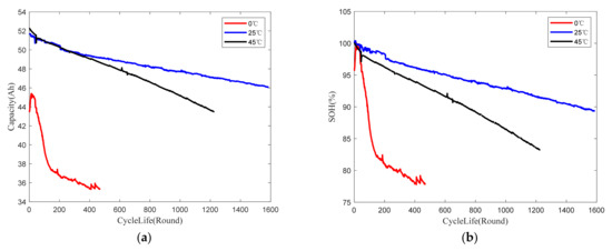 Section 3.2) is shown at 45 °C, 25 °C and 0 °C separately. SOH will degrade with the increase of cycle life. In the meantime, SOH curve at 0 °C declines faster than that at 25 °C and 45 °C. From the discussion in previous section, the diffusion rate of lithium ions decreases at low temperatures, leading to a reduction in the battery’s capacity and power output, which can impact its SOH [