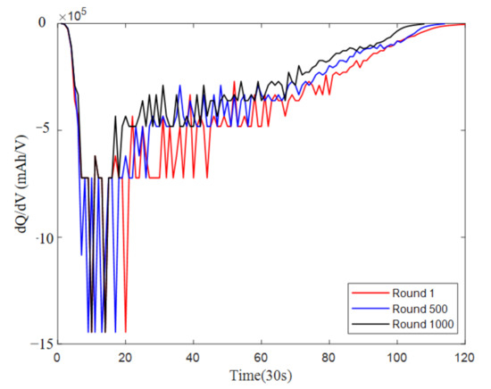 Section 3.2) under temperature 25 °C are drawn at round 1, round 500 and round 1000 respectively, and the dQ/dV curves present the difference value of accumulative discharge capacity between the current time and the previous time, the dQ/dV curves express the difference value of voltage between the current time and the previous time. The dQ/dV curves present a gradually increasing trend as the number of cycles increased. Therefore, the changes of dQ/dV curves can also characterize the aging of batteries to a certain extent.