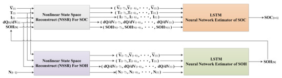 To address these issues, this paper investigates joint SOC and SOH estimation based on nonlinear state space reconstruction-long short-term memory (NSSR-LSTM) neural networks for battery packs. The impact factors of battery pack inconsistencies in EVs will be analyzed and extracted through experimental methods, and the estimation algorithms will predict SOC values based on these relevant factors. Throughout the estimation process, the nonlinear state space reconstruction (NSSR) will be utilized to construct a new phase state space for input variables’ stability, and the NSSR will be combined with long short-term memory (LSTM) to build the estimation model due to the LSTM’s ability to memorize historical information. This work makes contributions to the SOC and SOH estimation of battery packs by