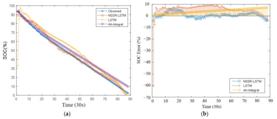Figure 15. The SOH estimation results remain stable within 1.8% accuracy across different time points of the 800th cycle. The SOH results are used as input parameters to estimate SOC. The joint estimation based on NSSR-LSTM yields an SOC RMSE of 2.43% for the 800th cycle. In comparison, the Ah-integral method yields an SOC RMSE of 6.02%, and the LSTM only method yields an SOC RMSE of 6.69%. These estimation results are shown in